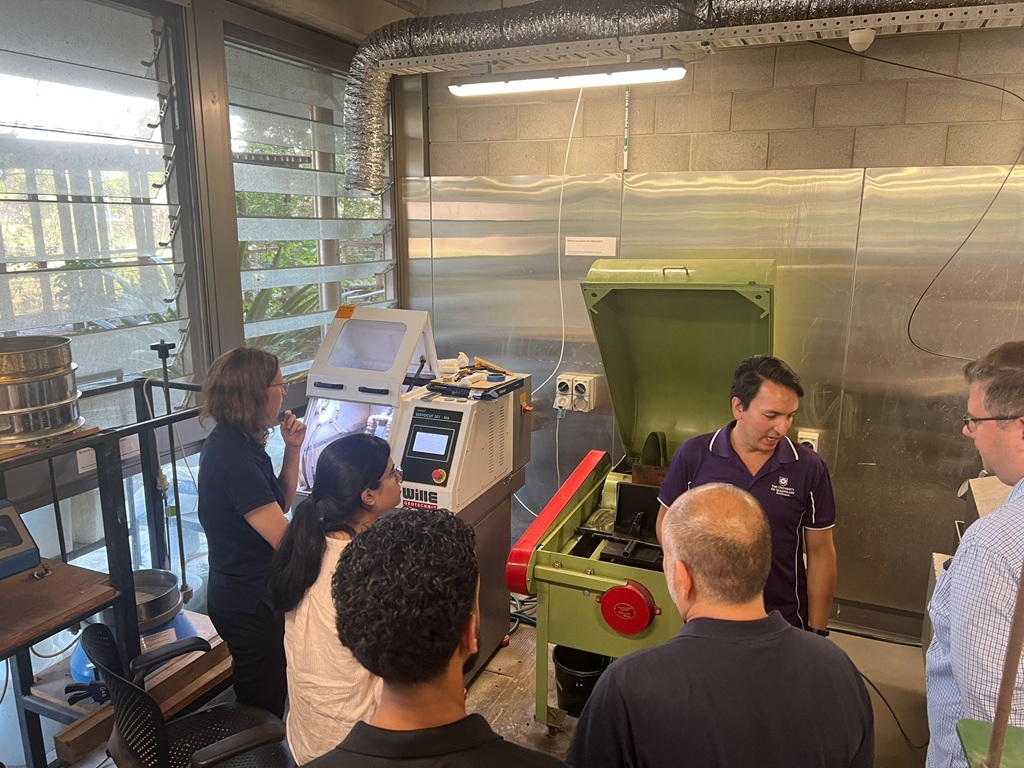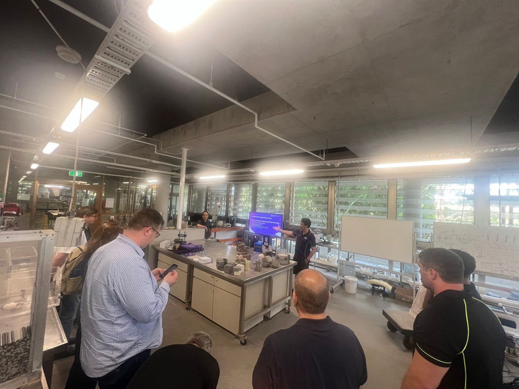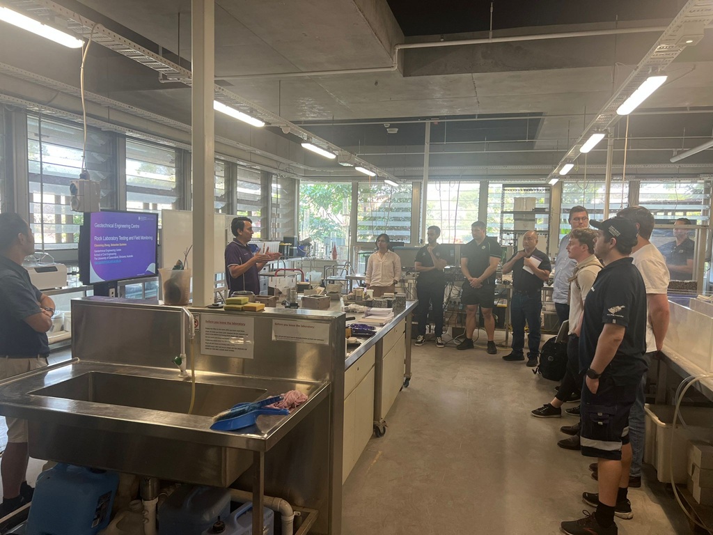 - A laboratory visit guided by Mr Sebastian Quintero Olaya and Dr Chenming Zhang (UQ Geomechanics Engineering Centre), showcasing advanced geomechanical testing and monitoring techniques.