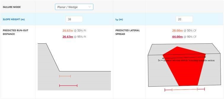 A runout calculator has also been built into the software to provide indicative stand off distances for varying slope heights and failure mechanisms. Estimates are provided for both the stand-off distance perpendicular to the toe of the slope and lateral to the slope face. An example of the outputs for a 38 m high slope are shown below.